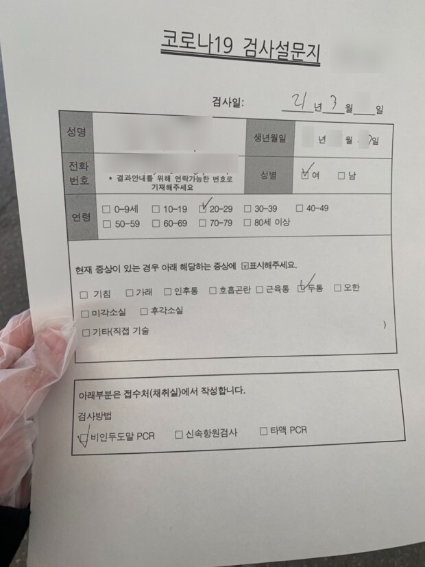 먼저 소독제로 손을 문지르라고 합니다. 그리고 코로나19 검사설문지를 작성해야 합니다.