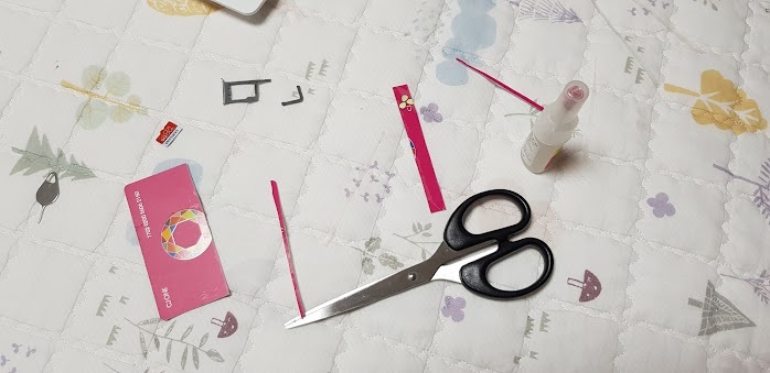 안 쓰는 카드를 길게 자릅니다. 유심카드가 들어간 부분에 잘 들어가게 자릅니다. 그리고 끝 부분에 본드를 묻혀줍니다. 본드를 묻힌 부분을 심카드 트레이가 들어간 슬롯에 넣고 본드가 마를 때까지 기다립니다. 그 후에 천천히 빼면 유심이 같이 나옵니다. 부러진 트레이가 나왔네요.