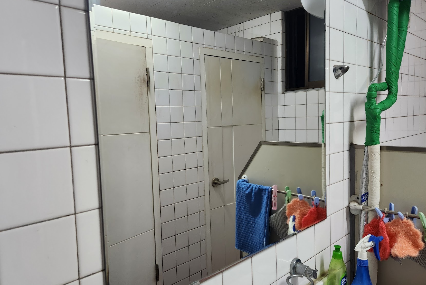 거울도 반질반질하게 닦습니다. 오래된 건물이라 깨끗이 해도 한계는 있습니다. 현 상태에서 최선을 다합니다. 1층 화장실은 내부 좌변기 시공한 후 바닥이 엉망이 되었습니다. 그래도 더 이상 더러워지지 않게 관리합니다.