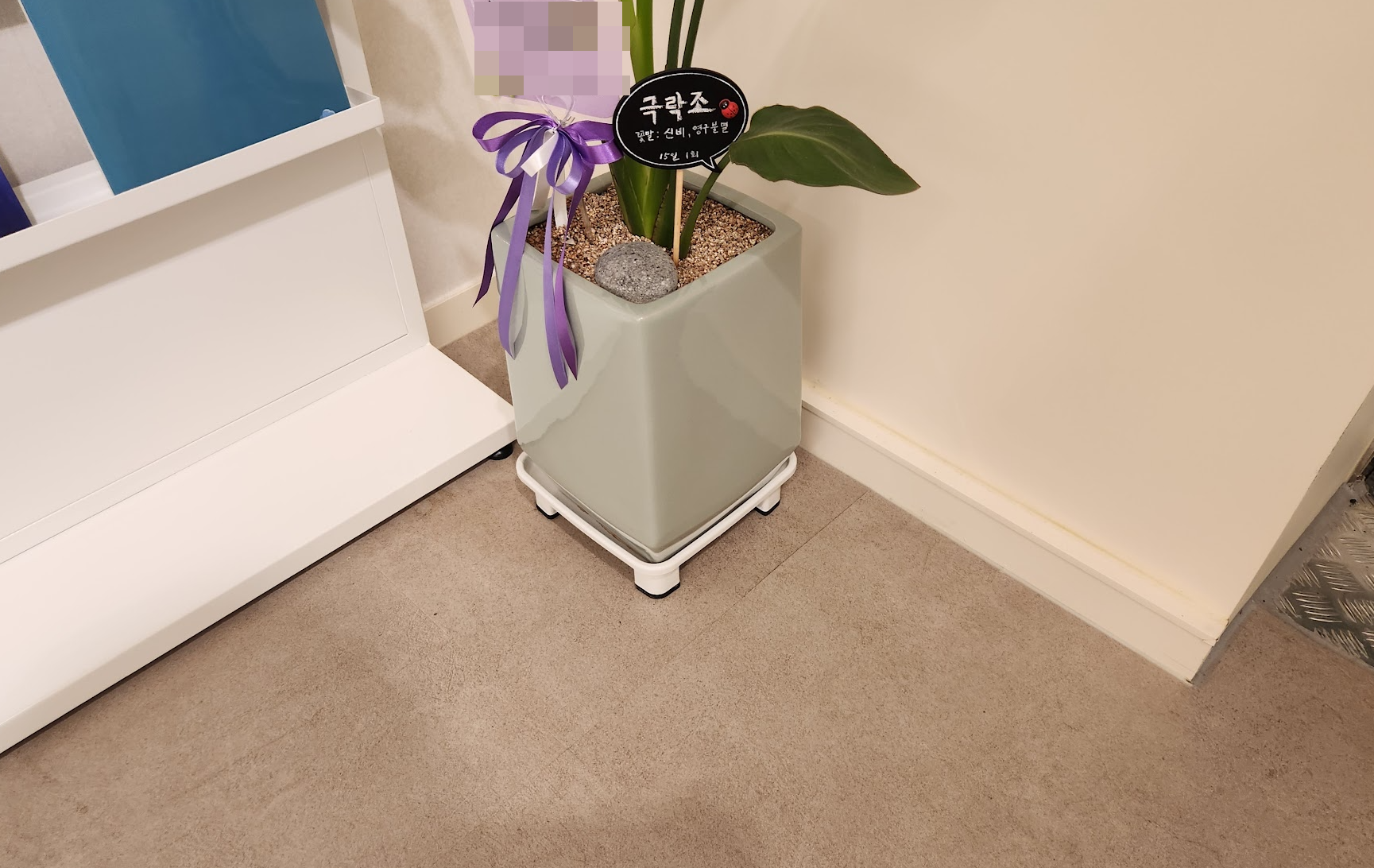 학원 입구에 화분이 있었는데 물을 많이 줘서 그런지 물이 넘쳐서 바닥에 얼룩이 있었습니다. 얼룩은 다 없애버렸습니다.