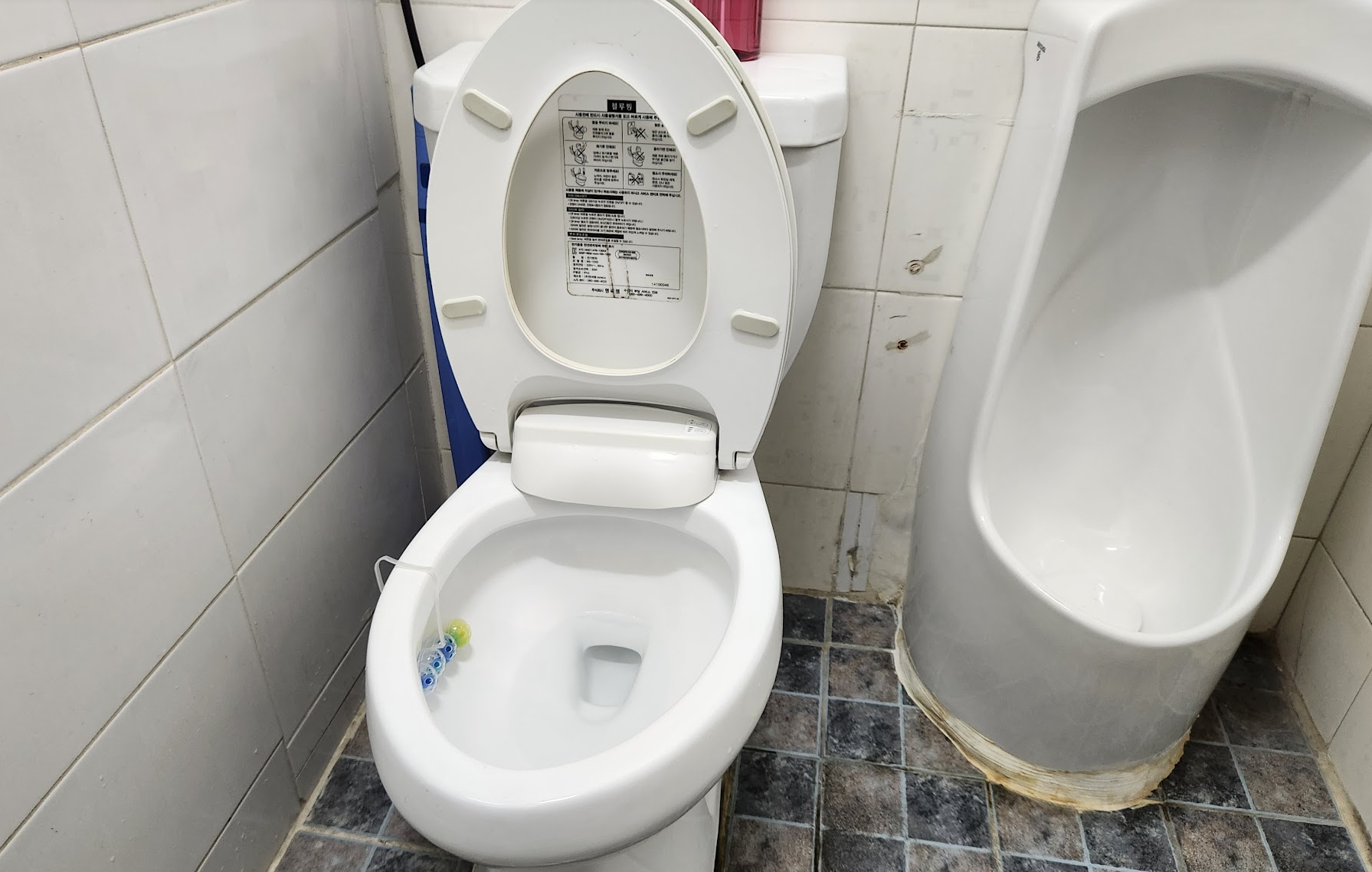 여기는 남자화장실인데요. 세상에~~~ 화장실 청소를 안해서 변기 커버도 그렇고 변기 안에도 곰팡이가 쫘악 퍼져 있었습니다. 소변기는 소변으로 찌들어서 아예 노랗게 되어 있었습니다. 바닥에는 껌이 붙어 있었고 소변으로 노랗게 곰팡이와 같이 얼룩져 있었네요. 하수구 커버도 들어내서 안쪽까지 깨끗하게 닦았습니다.