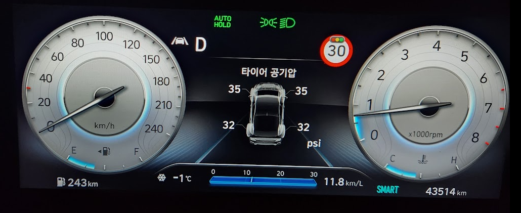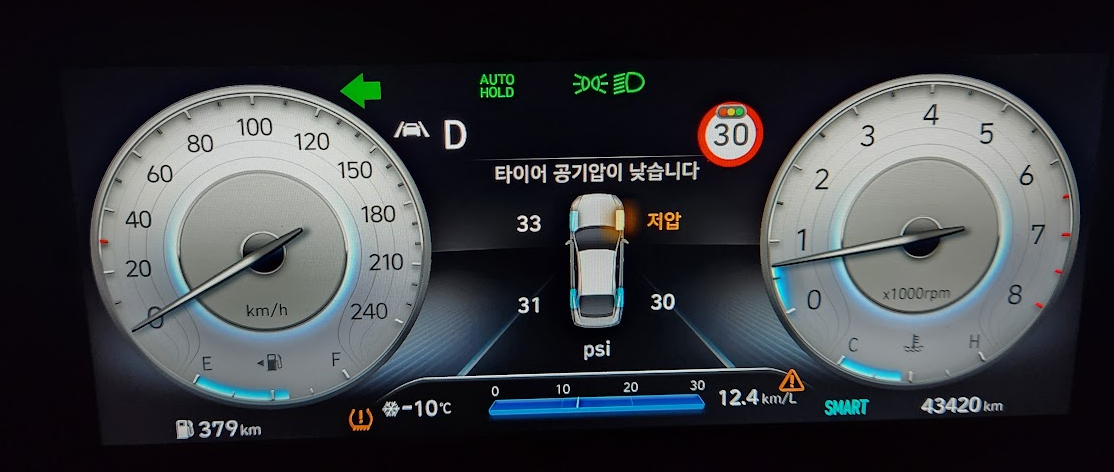 늘 타이어 공기압은 앞바퀴는 34 뒷바퀴는 31에 맞추었는데 영하 10도로 내려가니 뒷바퀴는 27로 내려가고 앞바퀴도 30에 오른쪽은 저압으로 떴습니다. 위 이미지는 주유소에서 다시 34에 31로 맞춘 후입니다. 한참 동안 운행을 계속해도 저압 표시가 사라지지 않아 걱정이 되었습니다. 다른 타이어는 조금 올라갔는데 오른쪽 앞바퀴는 아직 저압입니다.