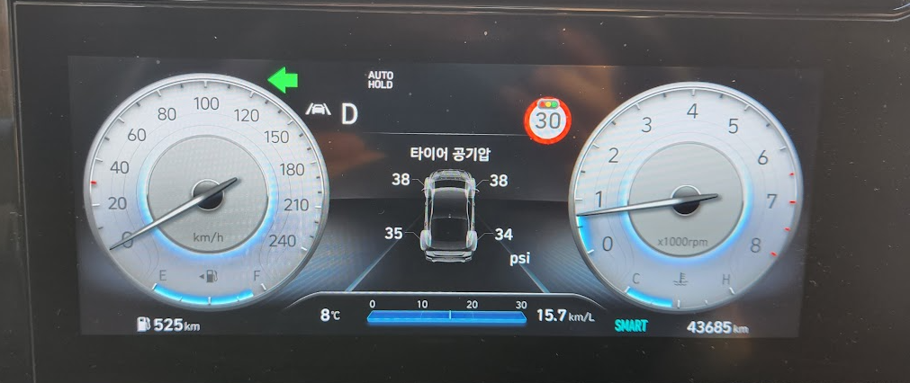 낮에 온도가 올라가니 이제 계기판에서 앞바퀴 38과 뒷바퀴 34~35를 보여줍니다.