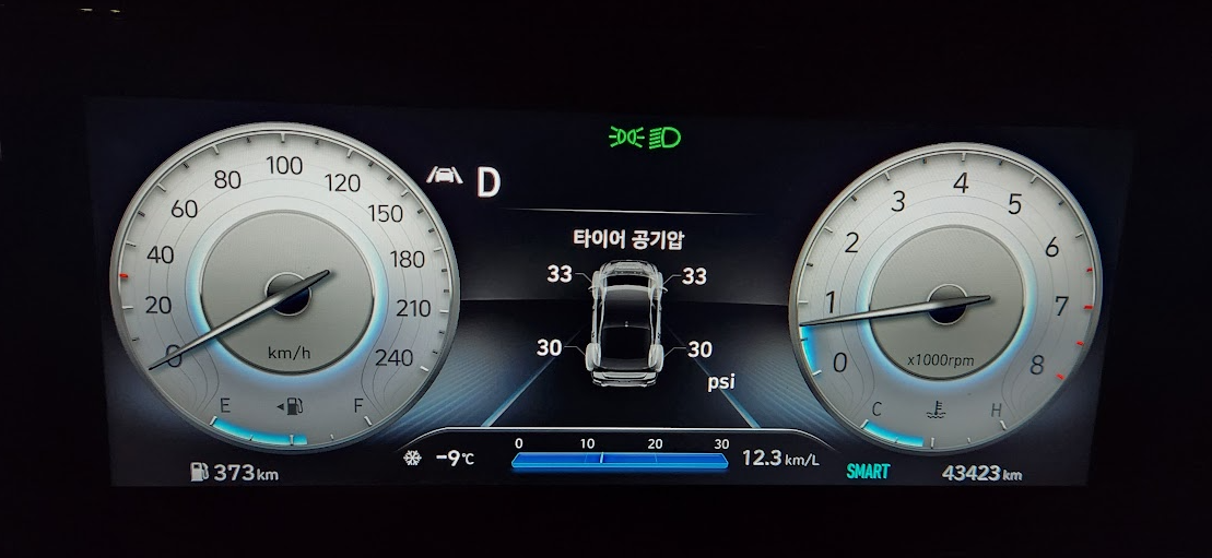 온도에 따라 계기판에서 보여주는 타이어 공기압의 변화가 심하니, 타이어 공기압이 갑자기 "저압"을 보여준다든지 할 때 당황하지 마시고 주유소에서 적당하게 충전하시고 운행하시면 좋겠습니다.