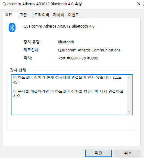 역시 블루투스 장치가 안보입니다. 원래대로라면 블루투스 장치가 보이고 물음표가 보여야 하는데 말이죠.