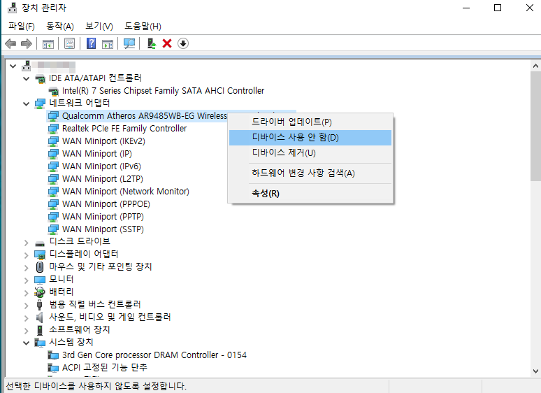 랜을 끄고 컴퓨터를 재부팅합니다. 그리고 장치관리자에 들어갑니다.