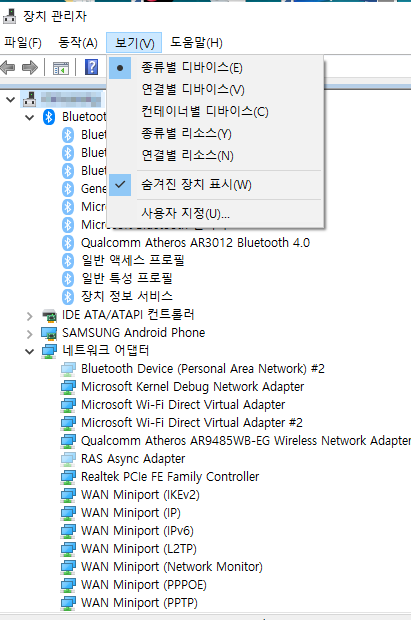 숨겨진 장치 표시를 클릭하니 블루투스가 보입니다.