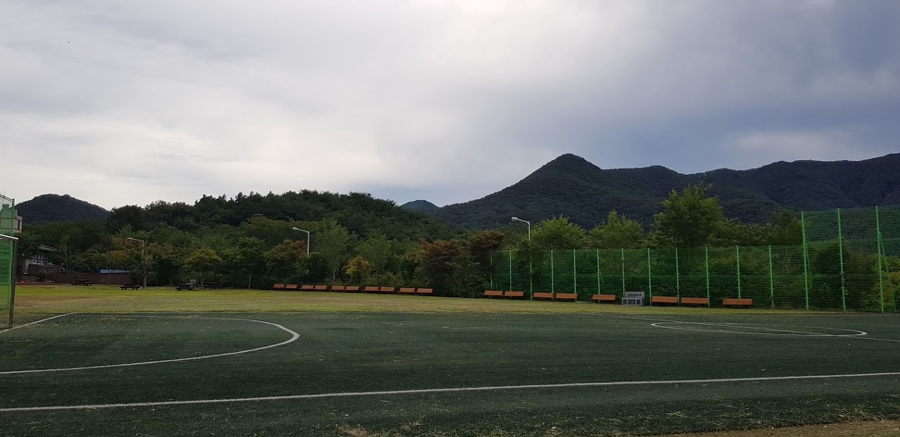 다음 날입니다. 대둔산호텔 앞에는 풋살장과 테니스장이 있고 풀밭이 있습니다. 여러 산에 둘러쌓여 조용하고 새소리가 아름답게 들립니다. 공기는 정말 너무너무 좋습니다.