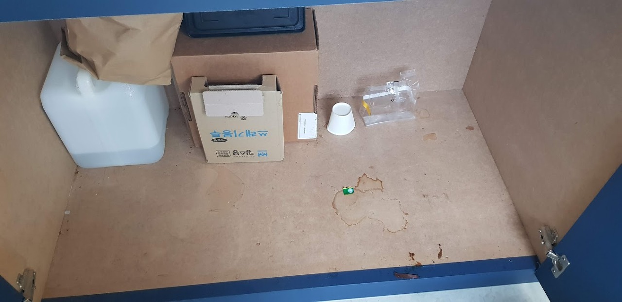 쓰레기통이 있던 서랍장?을 열어보니 이렇게 얼룩이 있었네요.