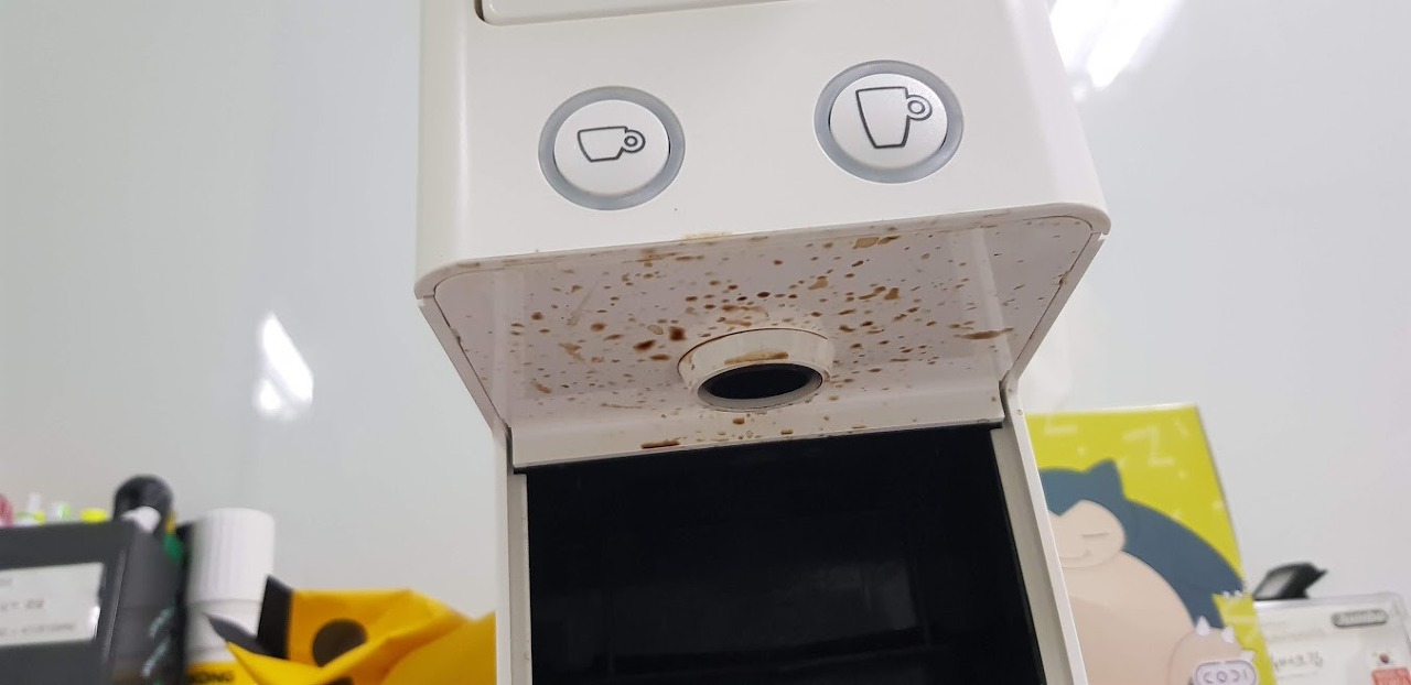 아까 봤던 바닥 얼룩 없앴고요. 커피머신 커피자국 없앴습니다.