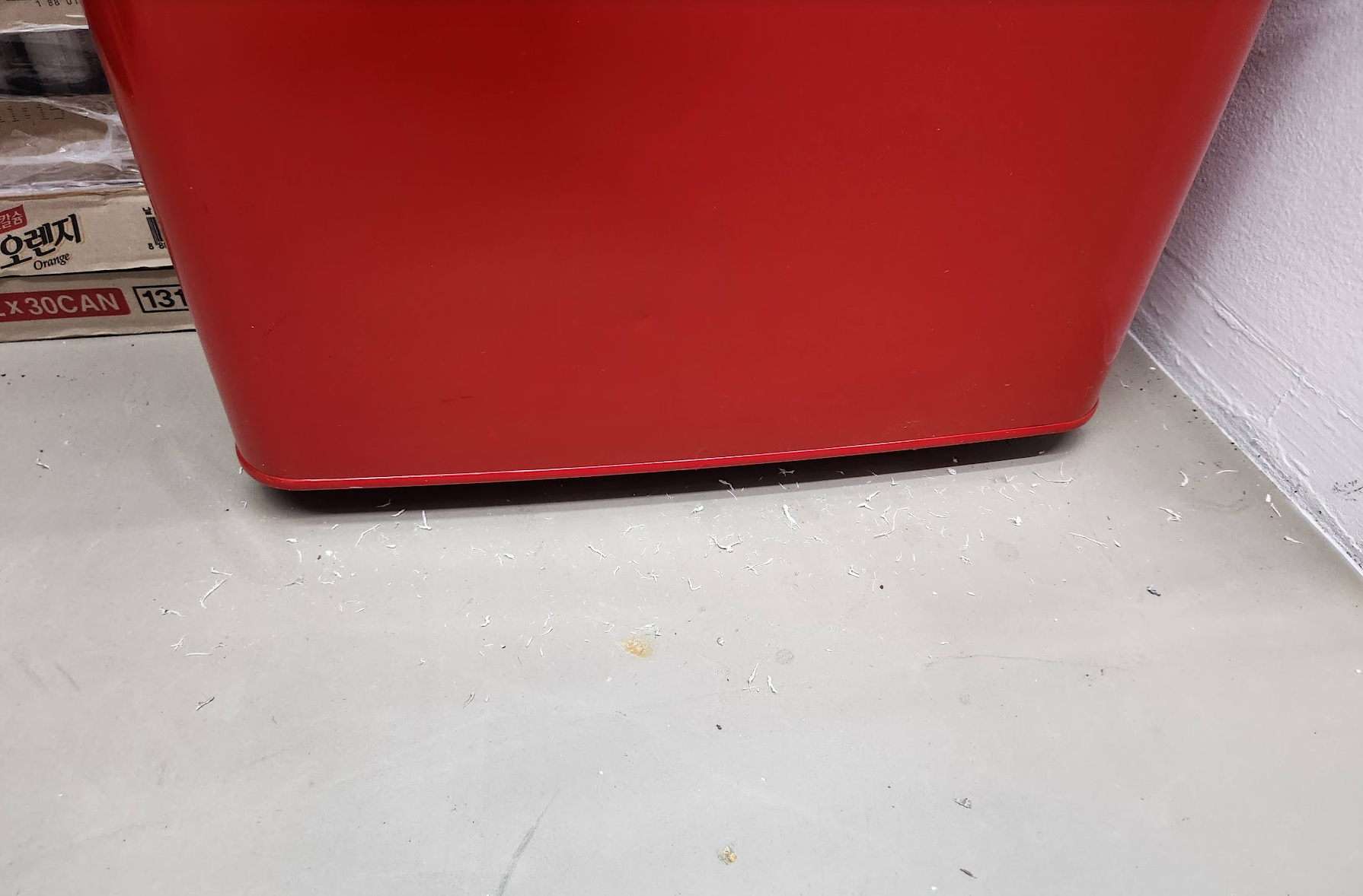 냉장고 밑에 종이 가루가 많습니다.