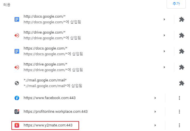 아래에 '허용' 부분에서 광고에서 봤던 주소 www.y2mate.com 을 찾았습니다. 찾았다 요녀석!
