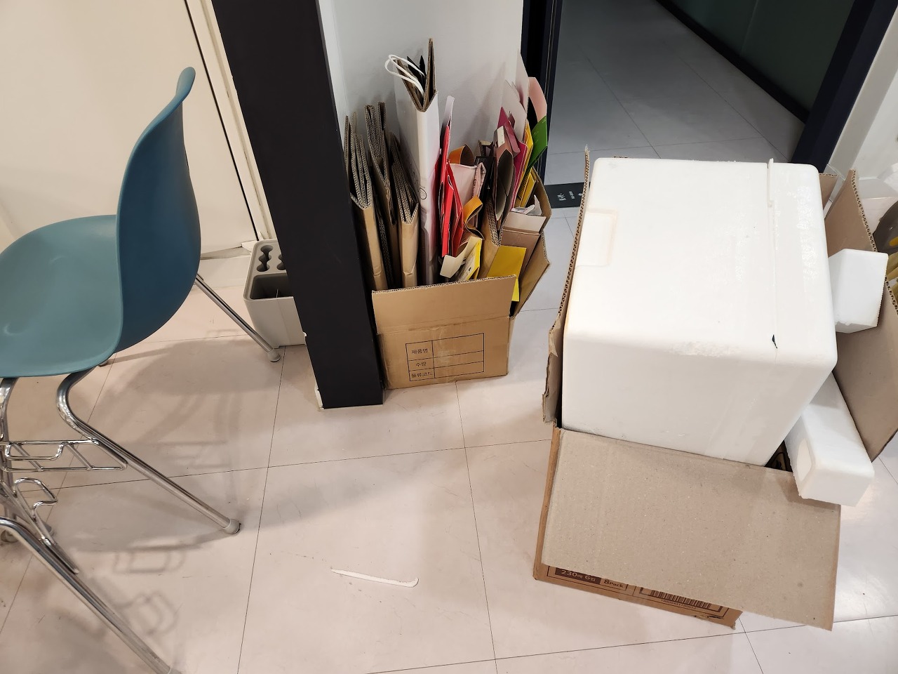 개인쓰레기통이 비닐 커버없이 제 각각이었던 모습에서 같은 비닐 커버로 깔끔하게 정리되었습니다. 개인 신발도 가지런히 정리되었습니다. 바닥에 얼룩이 상당히 많았는데 다 없어졌습니다.