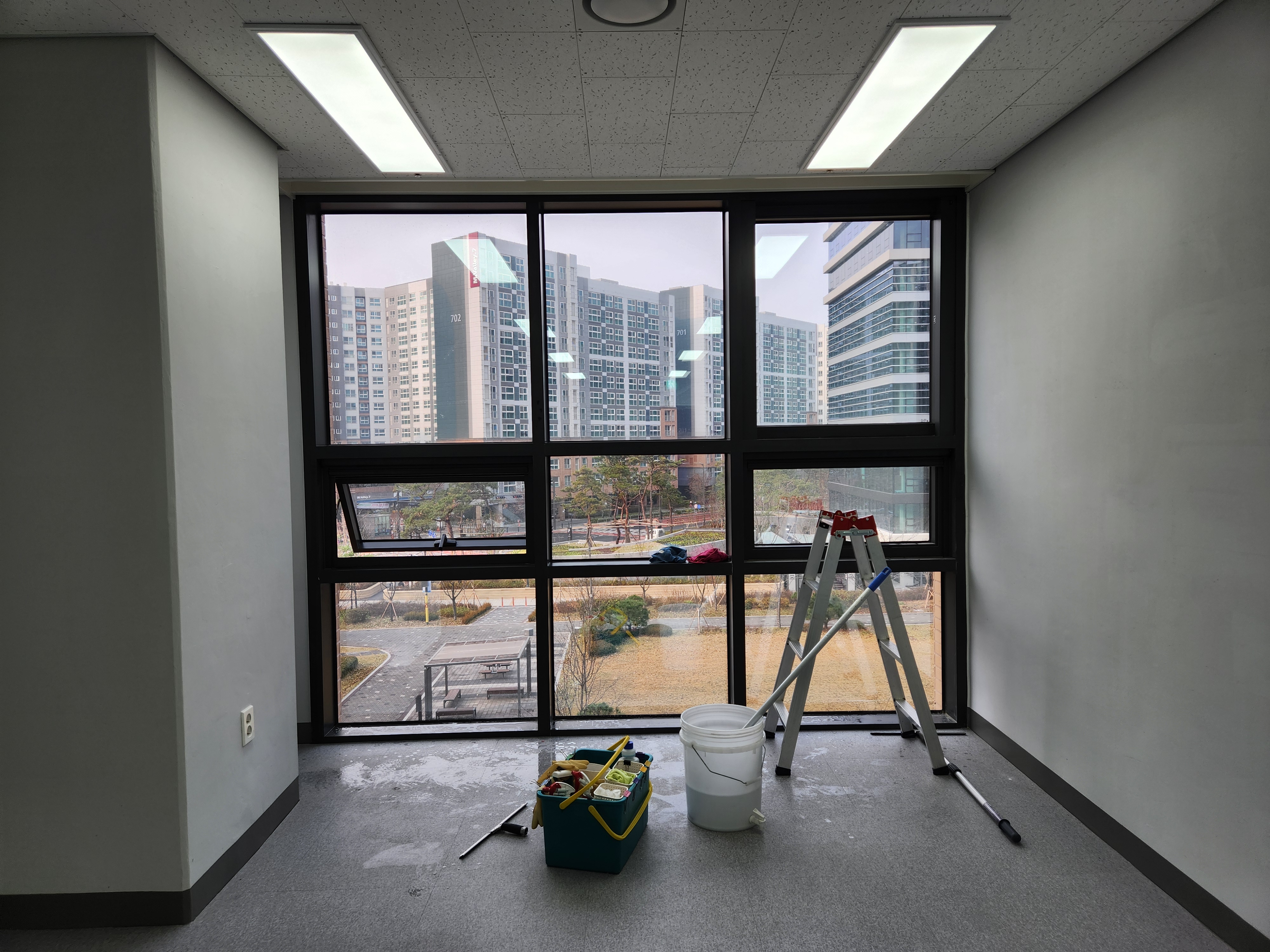 이제 거의 완공이 되어 입주자들이 들어오고 있습니다. 입주자 중에 한 대표님께서 입주청소를 해달라고 요청하셨습니다. 공사가 막 끝난 터라 먼지가 너무 많았습니다. 지하 2층에 있는 한쪽 벽면이 유리로 된 사무실이었는데, 층고가 6m 정도 되어서 복층으로 쓰면서 창고로 사용하시려고 한답니다.