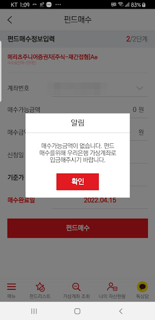 당연히 돈이 없으니 펀드 매수가 안됩니다. 메리츠자산운용은 펀드 구매에 직접 관여할 수 없고 우리은행을 통해서 진행합니다. 가입시 생성해준 우리은행 가상계좌에 돈을 입금합니다.
