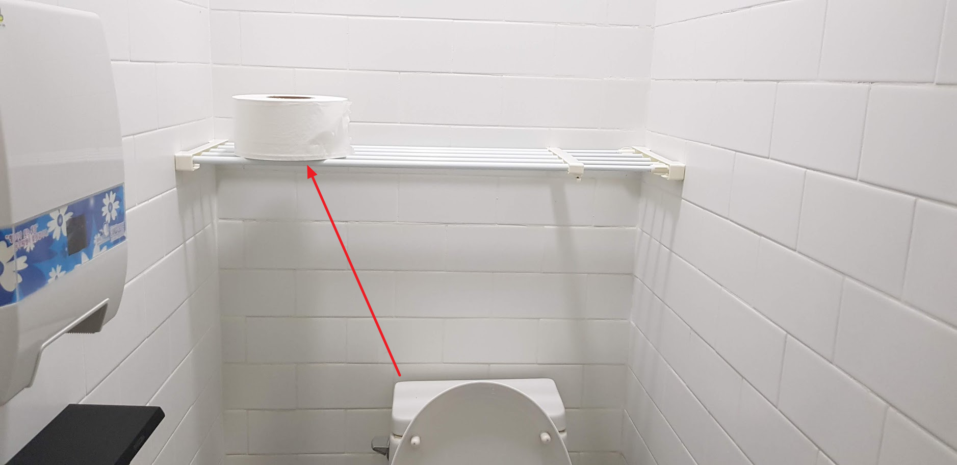 이런 롤 휴지는 커서 변기 뚜껑 위에 올려 놓을 수가 없고 올려 놓는다해도 변기 커버에 걸려서 떨어집니다. 참 불편합니다. 그래서 압축선반을 설치하고 그 위에 놓으니 간편하게 해결되었습니다.