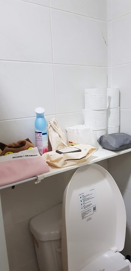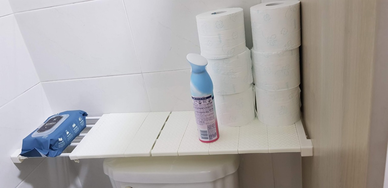 이런 롤 휴지는 커서 변기 뚜껑 위에 올려 놓을 수가 없고 올려 놓는다해도 변기 커버에 걸려서 떨어집니다. 참 불편합니다. 그래서 압축선반을 설치하고 그 위에 놓으니 간편하게 해결되었습니다.