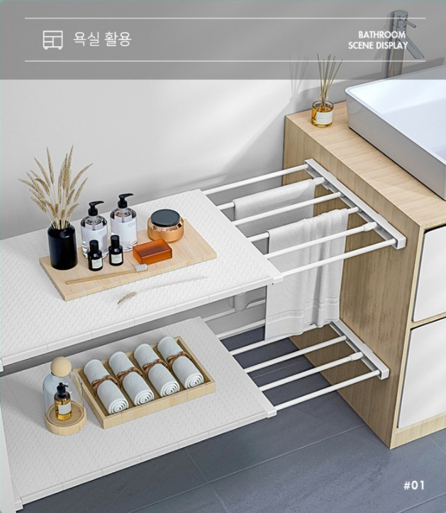 예를 들어 화장실에 변기위에 휴지를 올려 놓는다든지 하면 변기가 고장났을 때 휴지도, 같이 올려놓은 물건도 치워야 합니다. 이에 쉽게 해결할 수 있는 방법이 있습니다. 압축선반입니다.