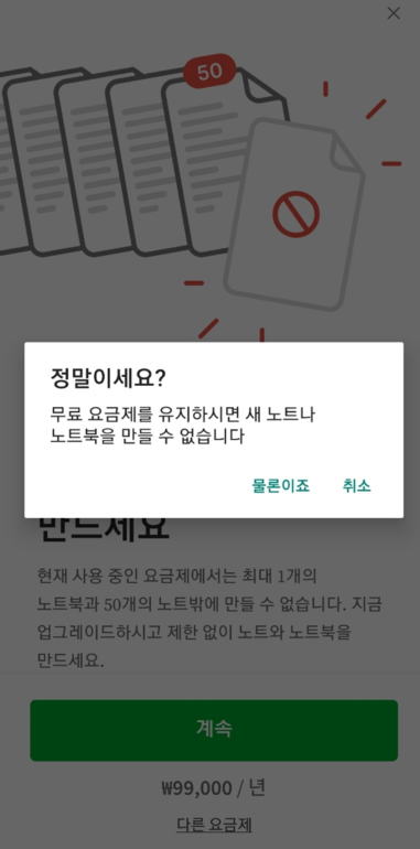 1년에 9만 9천원 혹은 월 10,500원을 내야 한다고 합니다. 무료요금제로는 지금까지 써 둔 노트만 확인할 수 있습니다.