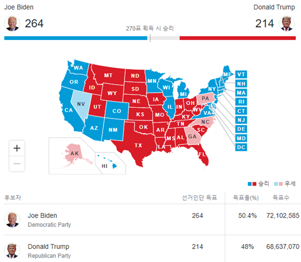 11·3 미국 대선에서 민주당 조 바이든 후보가 주요 경합주 역전 우위를 점하며 선거인단 확보 경쟁에서 도널드 트럼프 대통령을 앞서고 있습니다.