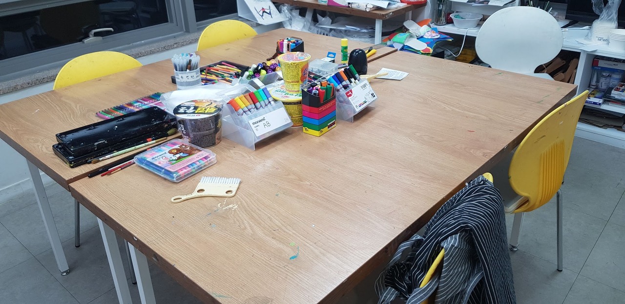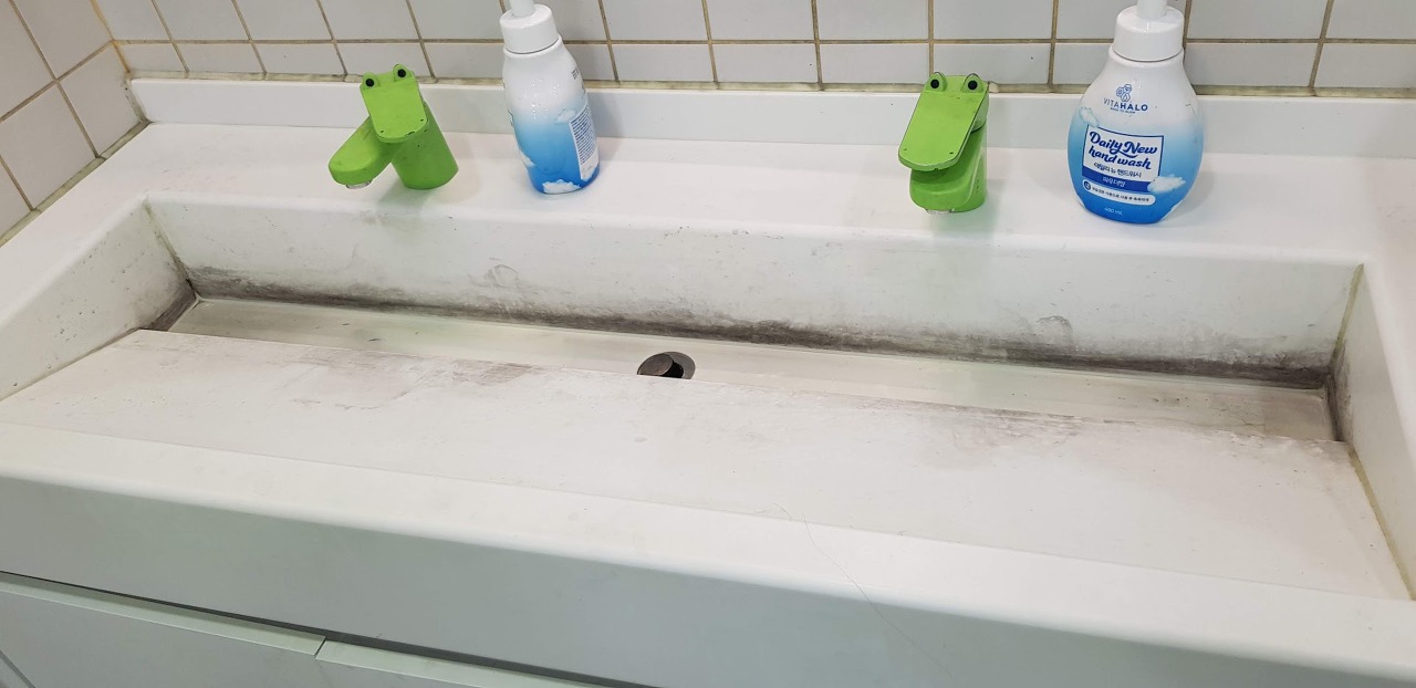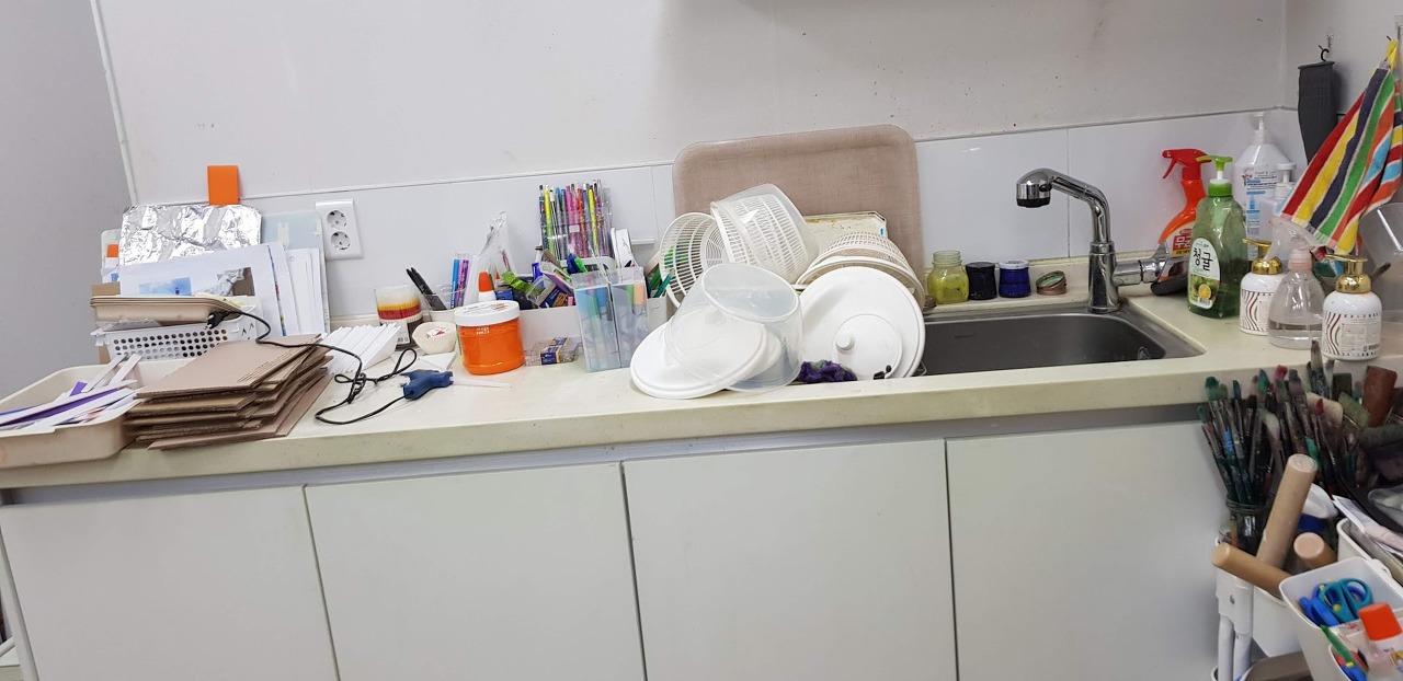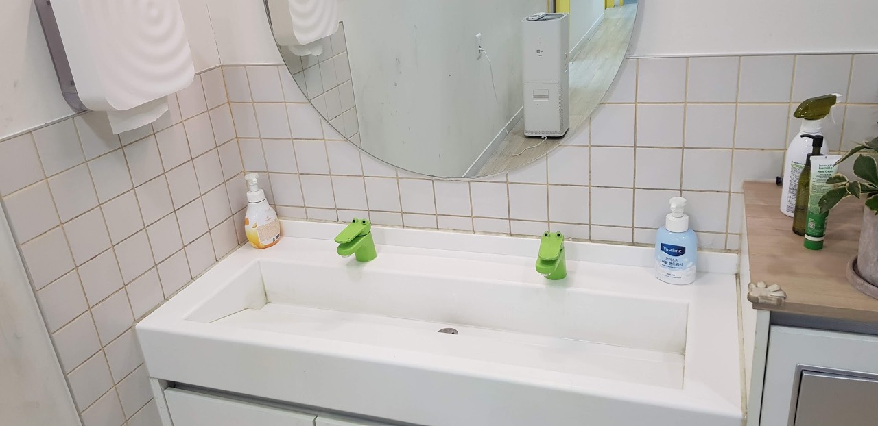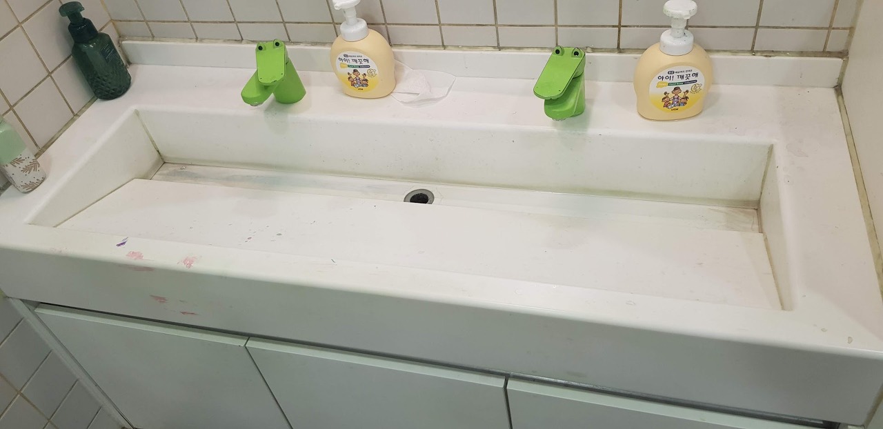 어린이들이 손을 씻는 세면대는 늘 물감으로 물들어 있습니다. 오늘은 그나마 깨끗하네요.