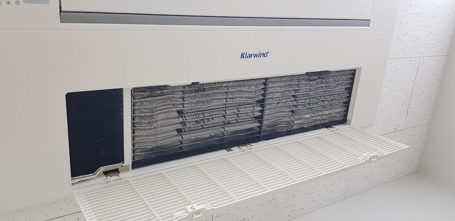 에어컨 필터를 떼어내는 과정에 덮어쓴 먼지 좀 보세요. 어마어마합니다. 하지만 청소 후 깨끗해졌답니다.