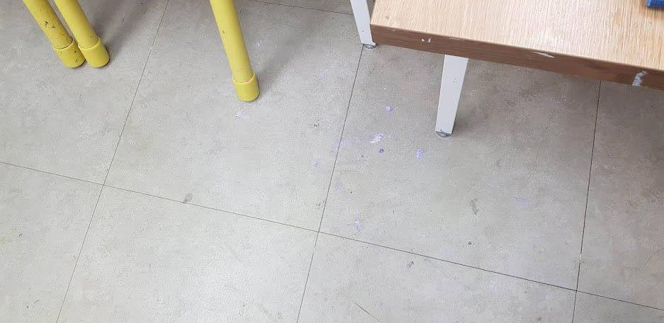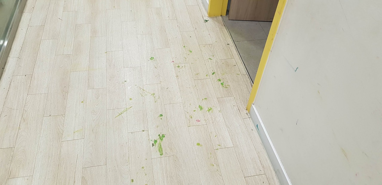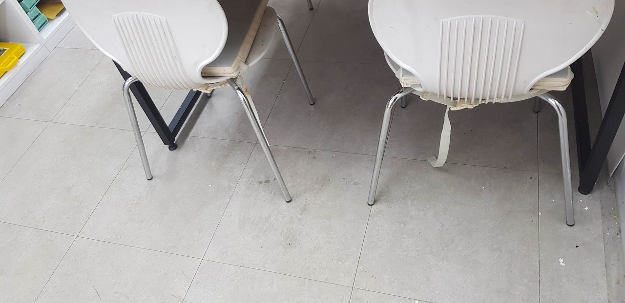 여기 미술학원은 글루건을 많이 사용합니다. 바닥에 글루건이 붙어서 밟으면 딱딱한 것이 점처럼 까맣게 변합니다, 제 성격에 그냥 넘어 갈 수가 없어서 다 긁어내고 있답니다.
