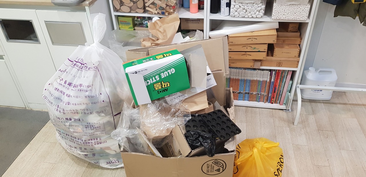 쓰레기를 버려달라고 선생님들께서 미리 모아놓으셨네요.