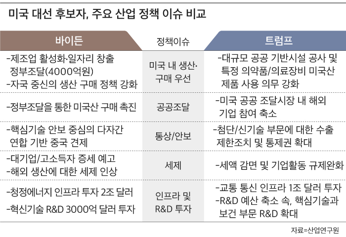 보고서에 따르면 두 후보는 미국 중심의 글로벌 가치사슬 복원과 탈중국화를 위해 기업과 무역·통상, 기술·안보를 서로 연계하는 방식의 전방위적인 산업정책 기조를 이어갈 것으로 전망됩니다.