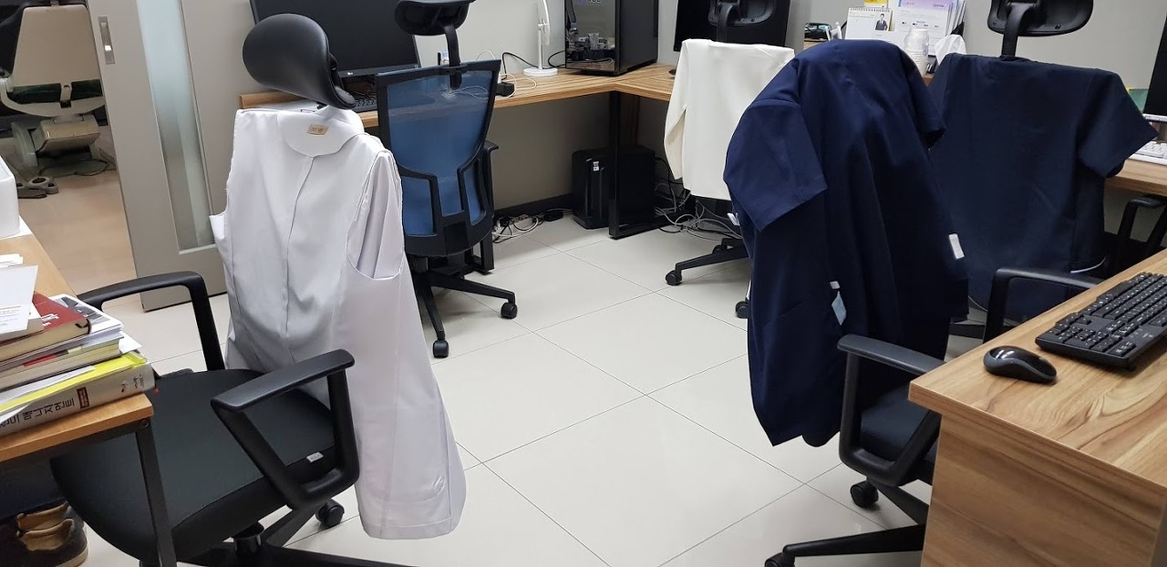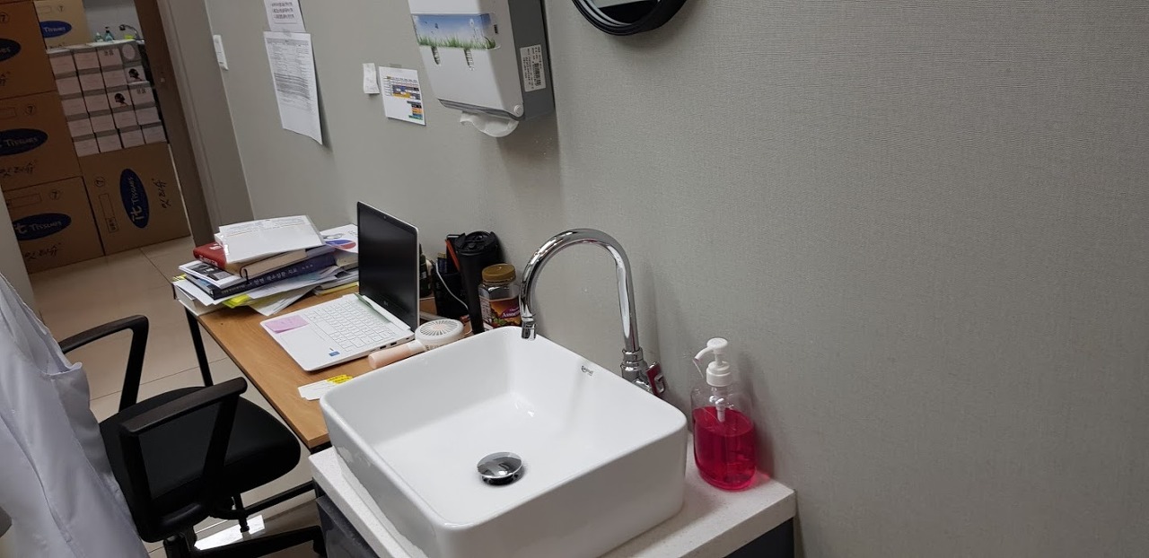 의사 선생님들께서 업무 보시는 공간에도 세면대가 있습니다. 반짝반짝하게 닦습니다.