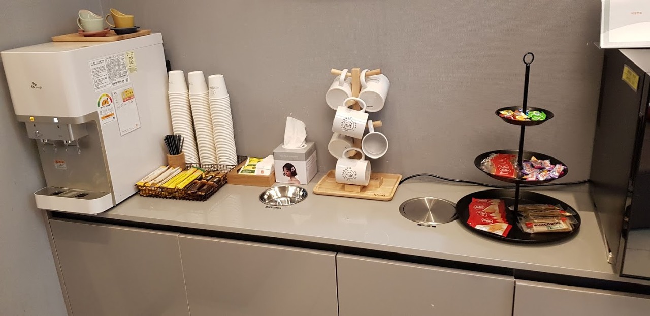 상담실 옆에는 간단히 음료수와 과자를 먹을 수 있는 곳이 있습니다. 정수기와 물을 버리는 곳과 안쪽 쓰레기통 매일 확인하고 닦습니다.