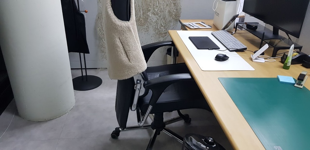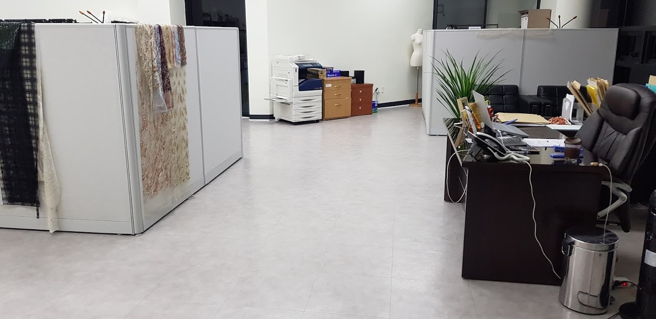 이 사무실에서는 반짝이 옷을 디자인하여 동남아에 수출하는 업무를 하는 것 같습니다. 그렇다면 바닥에 반짝이가 많겠네요.