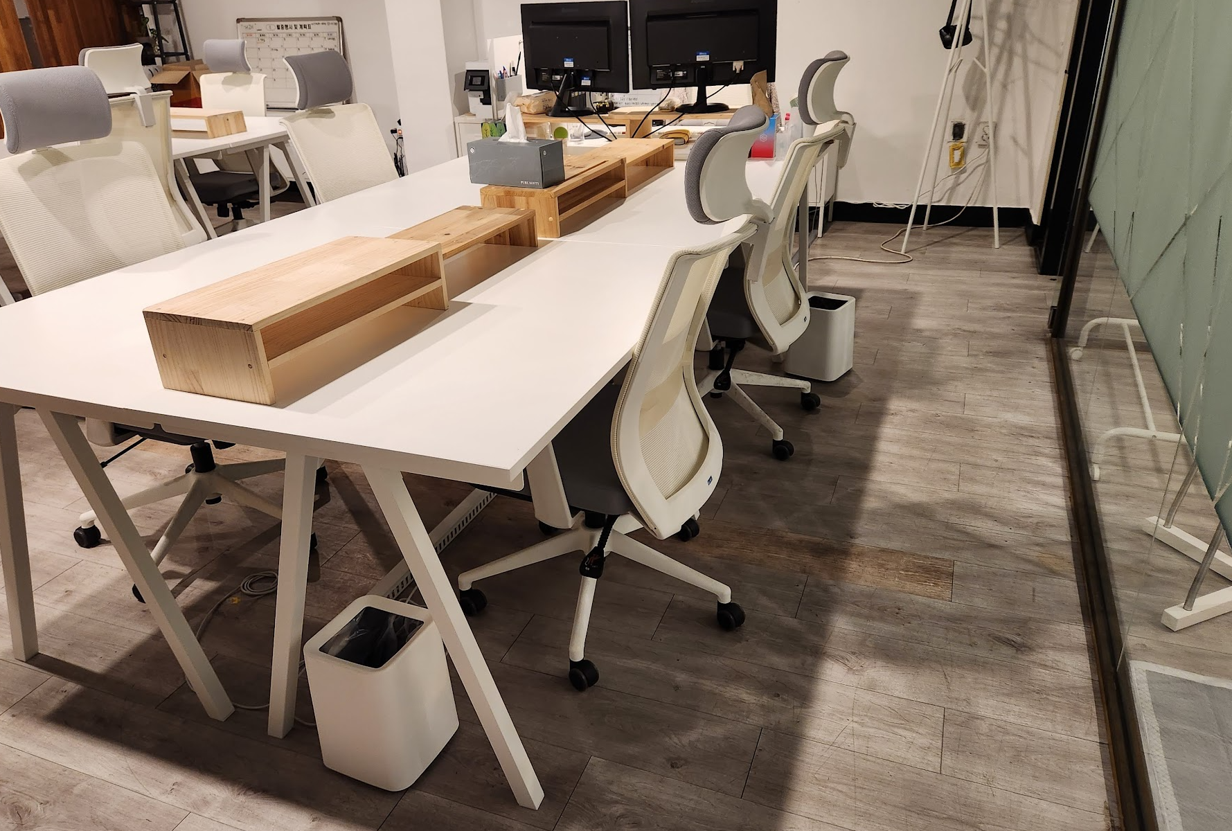 사무실 전체 조명이 어둡습니다. 나무바닥에 수많은 얼룩이 있지만 다행인지 불행인지 조명이 어두워 눈에 많이 띄지는 않습니다.