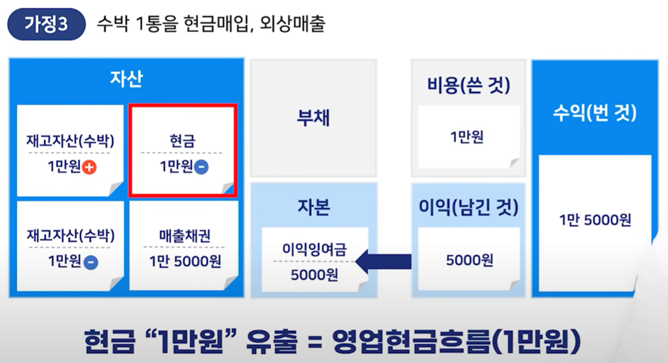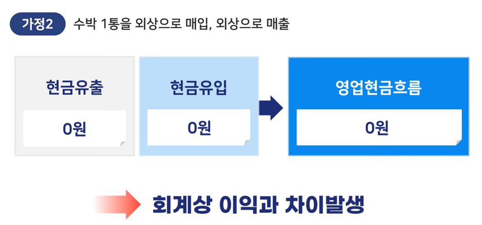 그래서 이런 거래의 경우는 손익계산서에서는 분명히 이익이 났는데 현금흐름으로는 오히려 현금이 유출된 마이너스인 상태로 가게 되는 겁니다. 그러면 그런 경우에는 기업이 현금을 얼마나 갖고 있는지 알고 싶을 때는 손익계산서만 봤을 때는 또 모르겠네요 그렇죠. 그래서 우리가 재무제표를 볼 때는 손익계산서에 아무리 이익이 많아도 캐시플로우(현금흐름)를 항상 봐야 합니다.