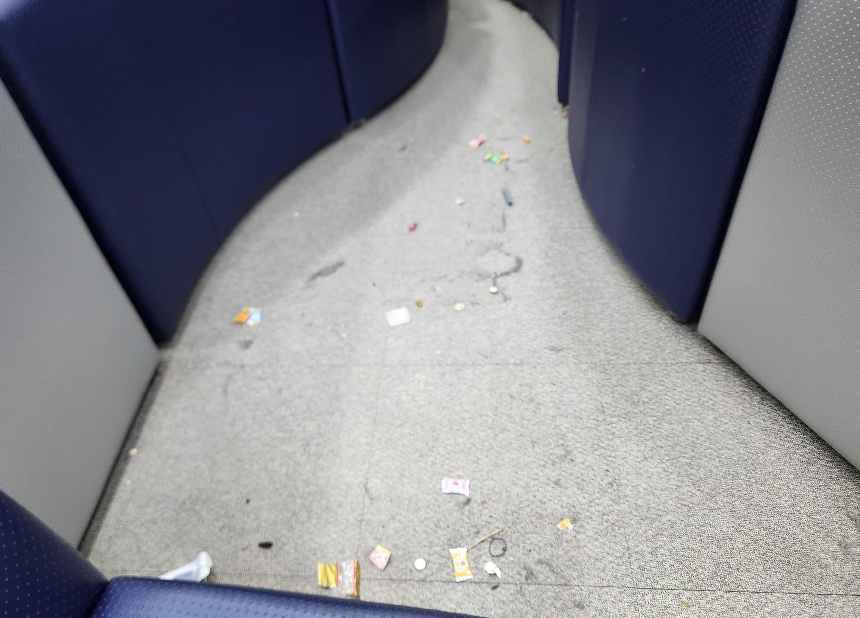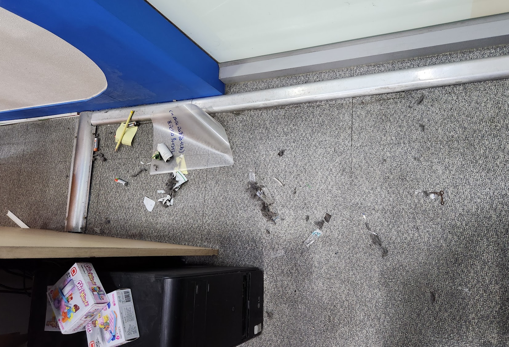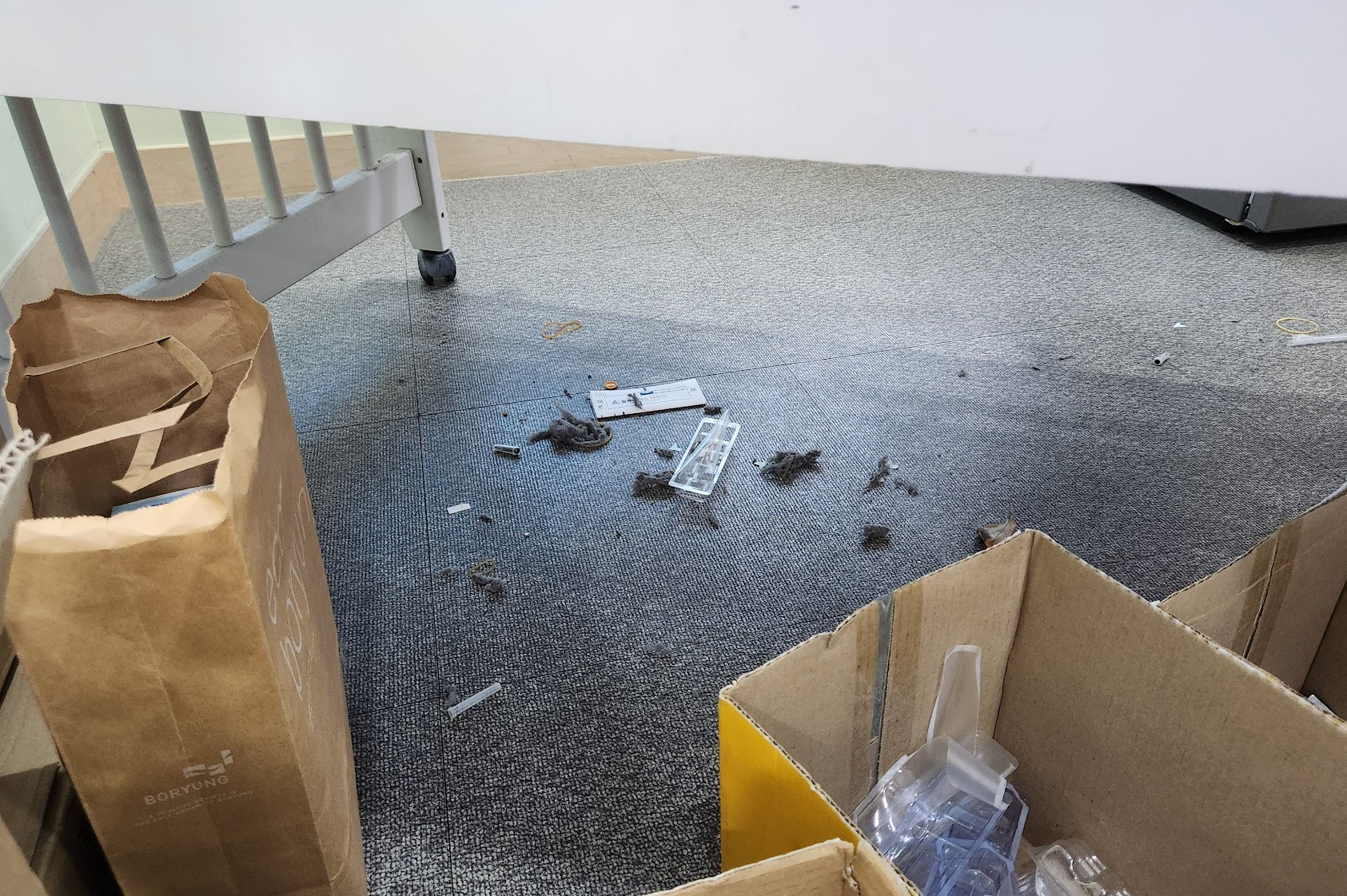 대기실의 큰 소파를 밀어보니 엄청난 쓰레기가 나옵니다.