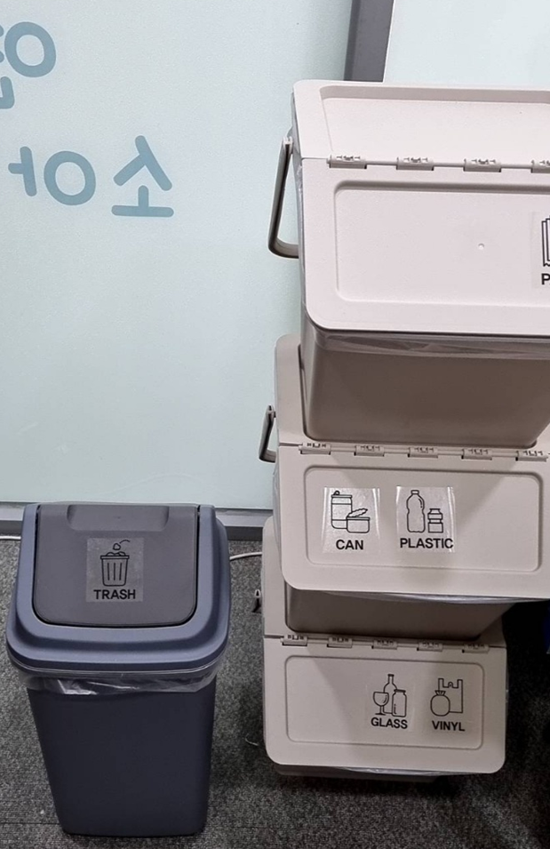 쓰레기 분리수거통은 씻었는데 씻어도 너무 지저분해서 원장님께 다른 것으로 구매해 달라고 요청드렸어요. 그래서 새로운 분리수거통을 사 주셨습니다. 일반쓰레기통은 따로 안 사주셔서 저희가 구입해서 두었습니다. ㅠ