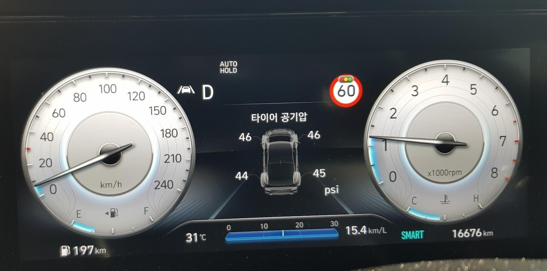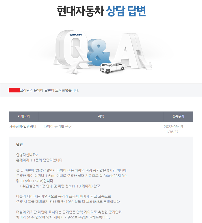 그리고 아반떼 CN7 16인치 기준으로 앞타이어는 34 psi 뒤 타이어는 31 psi 가 적당하다고 합니다.