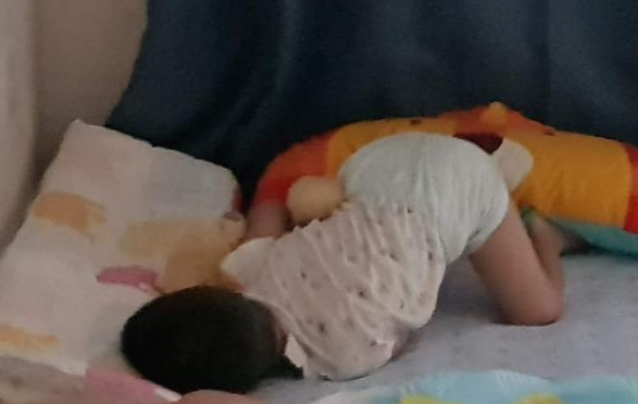 이 자세는 개구리 자세라고도 하고 6개월부터 12개월 아기 때 일반적이라고 합니다. 아기가 좀 더 커서 걷게 되면 서서히 바로 자게 된다고 하네요.