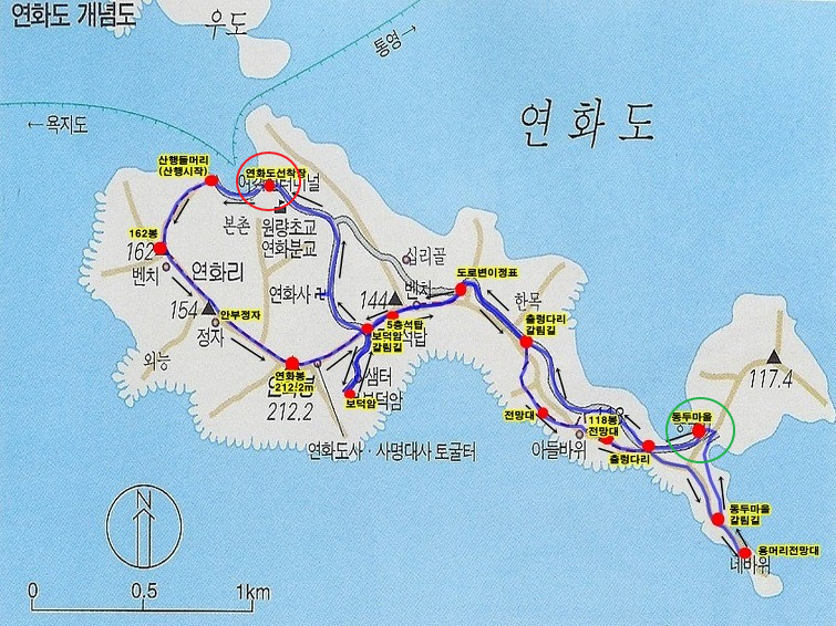 연화도 본촌, 선착장 근처에 있던 아이들은 자기집이 있는 동두마을로 달리기(빨간색 동그라미에서 초록색 동그라미쪽으로) 시작했습니다. 그 당시는 연화도 본촌과 동두마을 사이에는 길이 좁고 40분 정도 걸리는, 공동묘지까지 있는, 먼 산길이었습니다.