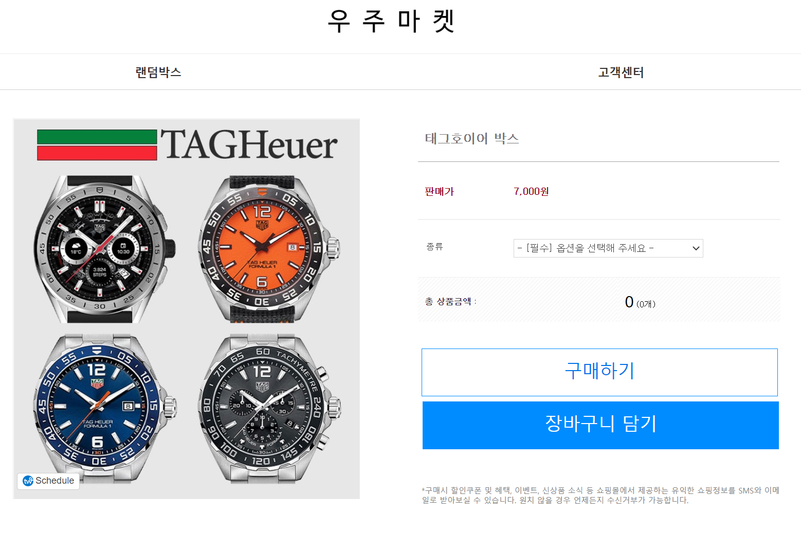 우주마켓 랜덤박스에서 태그호이어 박스를 다시 클릭해 보니 구성상품 중에 랜덤으로 발송된다고 되어있고 맨 아래쪽에 이렇게 되어 있으니 엄밀히 말하면 우주마켓에서 거짓말한 것은 아닙니다. ^^