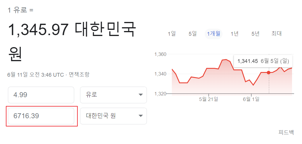 4.99유로 현재 환율 계산해서 7,000원이 안됩니다. ㅋㅋㅋ