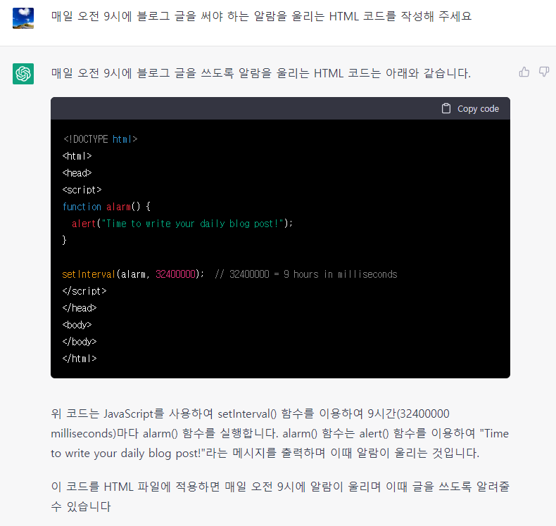 매일 오전 9시에 블로그 글을 써야 하는 알람을 울리는 HTML 코드를 작성해 달라고 했습니다. 정말 순식간에 만들었습니다.