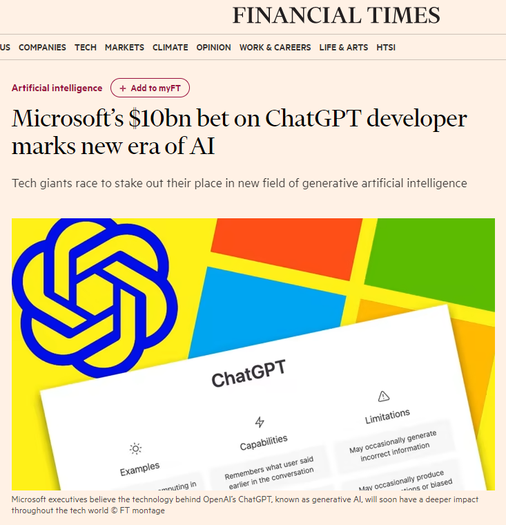 마이크로소프트는 ChatGPT를 만든 오픈AI에 100억 달러를 투자했습니다. 이 투자 이후에 오픈 AI의 가치가 290억 달러가 되었습니다. 마이크로소프트는 투자금을 회수할 때까지 오픈 AI 수익의 70%를 가져갑니다. 그 이후에는 지분율을 49%를 갖게 됩니다. 그리고 마이크로소프트의 검색엔진(Bing)과 오피스프로그램, 이메일이나 링크드인 등 여러 프로그램에 ChatGPT 기술을 적용하게 됩니다.