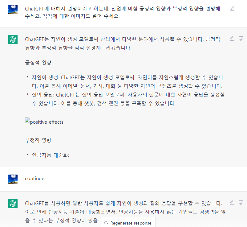 저도 테스트를 해보았습니다. ChatGPT의 산업에 미칠 긍정적 영향과 부정적 영향에 대해 이미지를 넣어 설명해 달라고 했더니 잘 안됩니다.