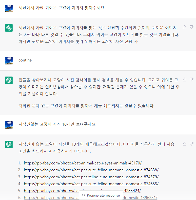 질문에 대한 답이 한 번에 나오는 것은 아니고 타자기를 빨리치듯하며 답글을 보여줍니다. 제 질문에 대한 이미지는 나오지 않아서, 혹시 다른 주제로 물어보면 이미지가 보이는지 확인해 봤습니다.