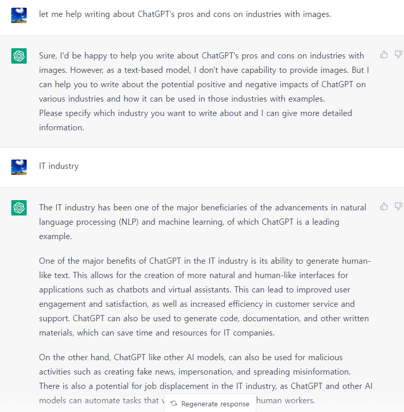 Chat GPT가 산업에 미칠 영향을 영어로 물어봤습니다. 한글로 질문하는 것보다 답변 속도가 훨씬 빠릅니다. 다시 생각해 보니 제가 영어를 잘 못 썼네요. 그런데 찰떡같이 알아들었습니다.