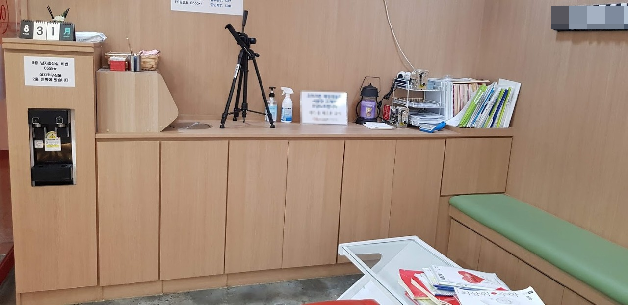 로비 쪽 정수기 주변도 깨끗이 닦아줍니다.