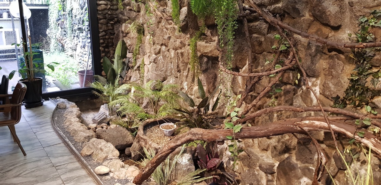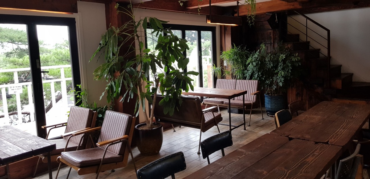 카페 뒤에 배경은 돌담을 그대로 살리고 앞에 조그마한 시냇물이 흐르도록 인테리어를 했습니다.